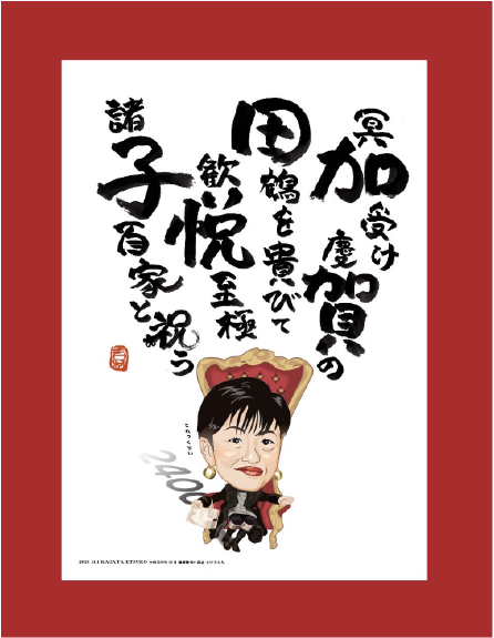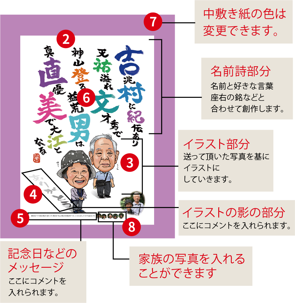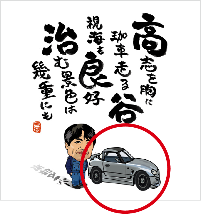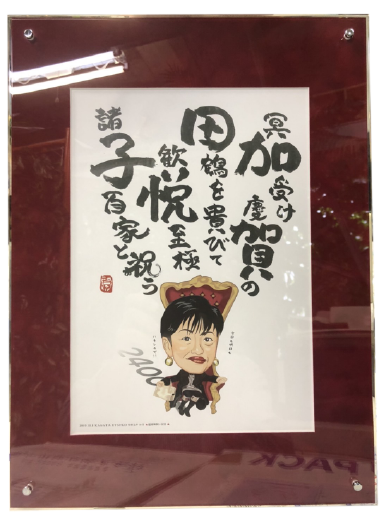 20年ほど前から、イラストや似顔絵の依頼があり、そのイラストに名前の付いた縁起の良い筆文字を組み込んだイラスト額縁をプレゼントしたのがきっかけでした。